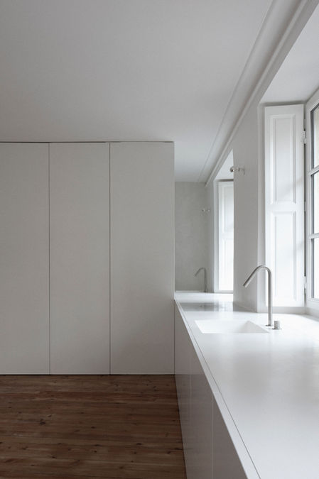 L’appartement, situé à l’angle d’un bâtiment en pierre du XVIIe, bénéficie d’une double orientation avec de grandes ouvertures qui rythment l’espace et le baignent de lumière.